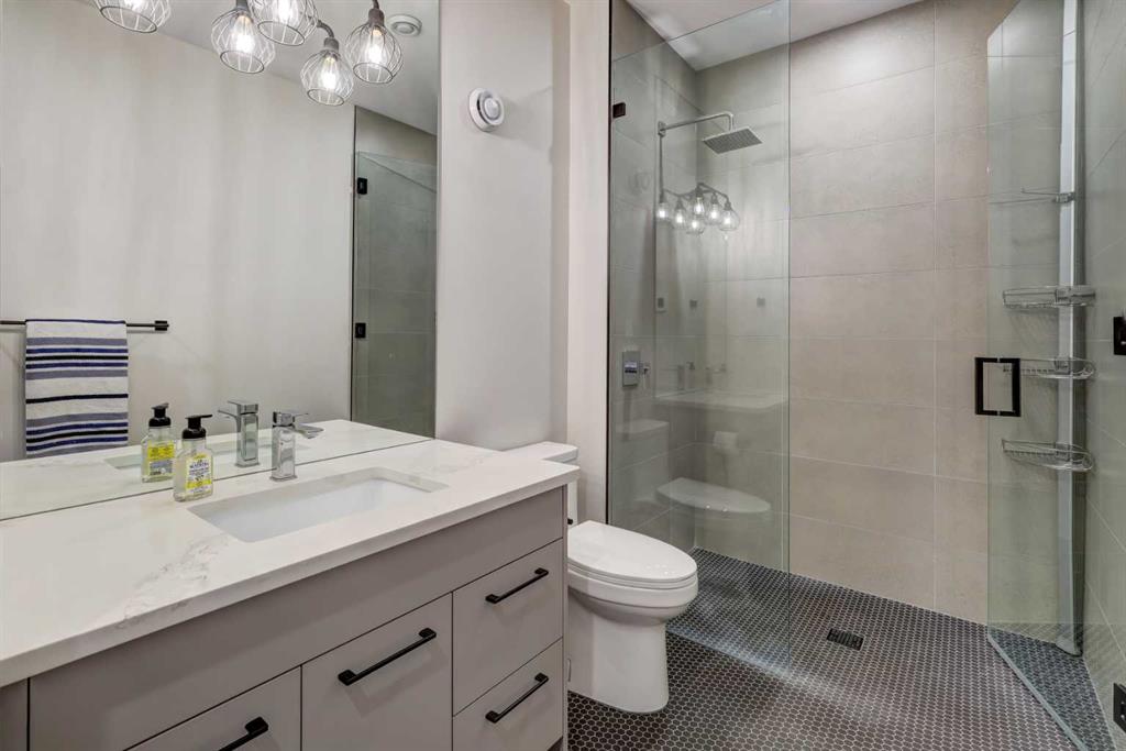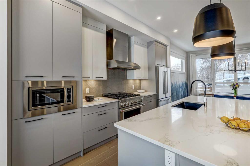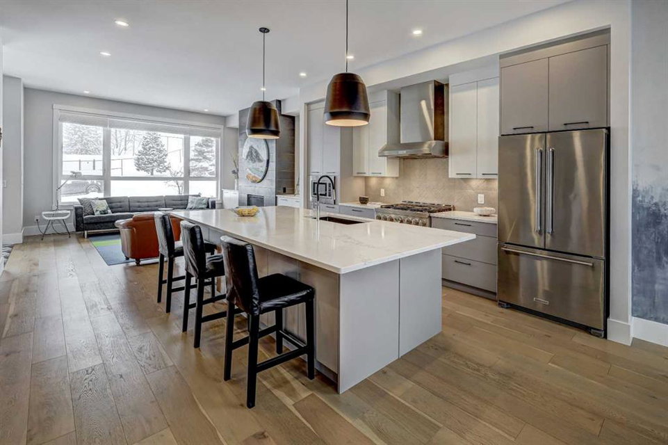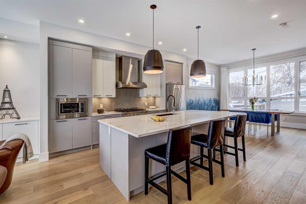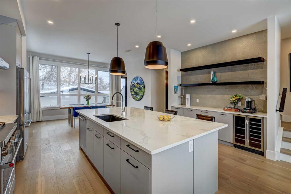 Welcome to the perfect inner-city lifestyle in this bright & open two-storey semi-detached home located in the heart of Bridgeland, just across from Schule Park & Delta West Academy. Enjoy the feeling of 10′ ceilings on the main floor, creating an airy & spacious atmosphere. The kitchen is a standout feature, boasting a huge island with extensive white quartz counters, an abundance of cabinets, upscale appliances including a 6 burner gas stove. Additionally, the kitchen includes a convenient coffee counter/butler pantry, perfect for storing and preparing beverages. The master bedroom is a retreat unto itself, with a vaulted ceiling & a beautiful ensuite that features heated floors, including the shower floor & bench, as well as a separate soaker tub for relaxation. The second bedroom/Artist’s studio can easily be turned back into 2 bedrooms up. The fully finished basement adds versatility to the home, offering a third bedroom, family room with wet bar & cool wine racks, a 3-piece bathroom & lots of storage. Outside, the south-facing backyard boasts easy maintenance-free landscaping, providing a perfect space for outdoor enjoyment. Extra features of this home include air conditioning, extra soundproofing between units, white oak hardwood on the main & upper floors, skylights, UV film on South-facing windows, $20K in Hunter Douglas blinds, & a wider lot compared to typical semi-detached homes. Walk to work downtown & all amenities on 1st Ave – Made By Marcus, Starbucks, restaurants, boutiques & more! Don’t miss out on the opportunity to own this charming home in a desirable location