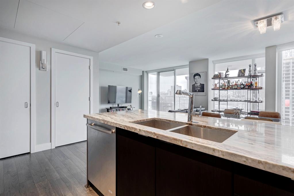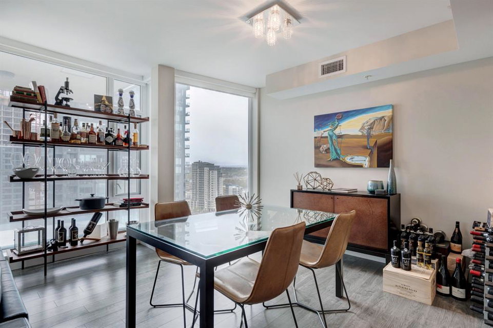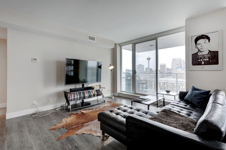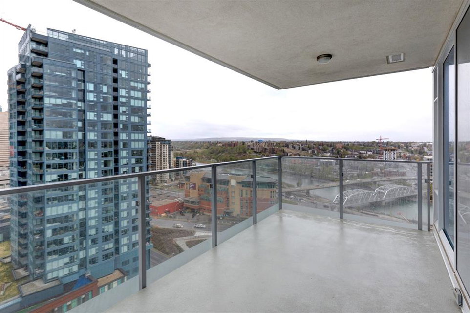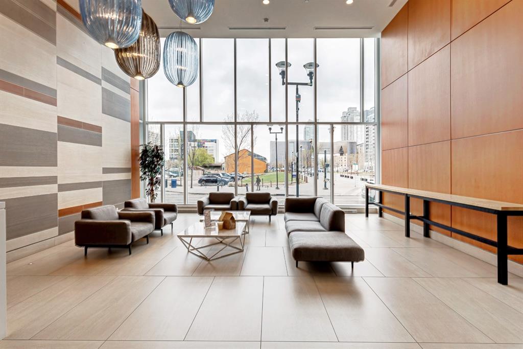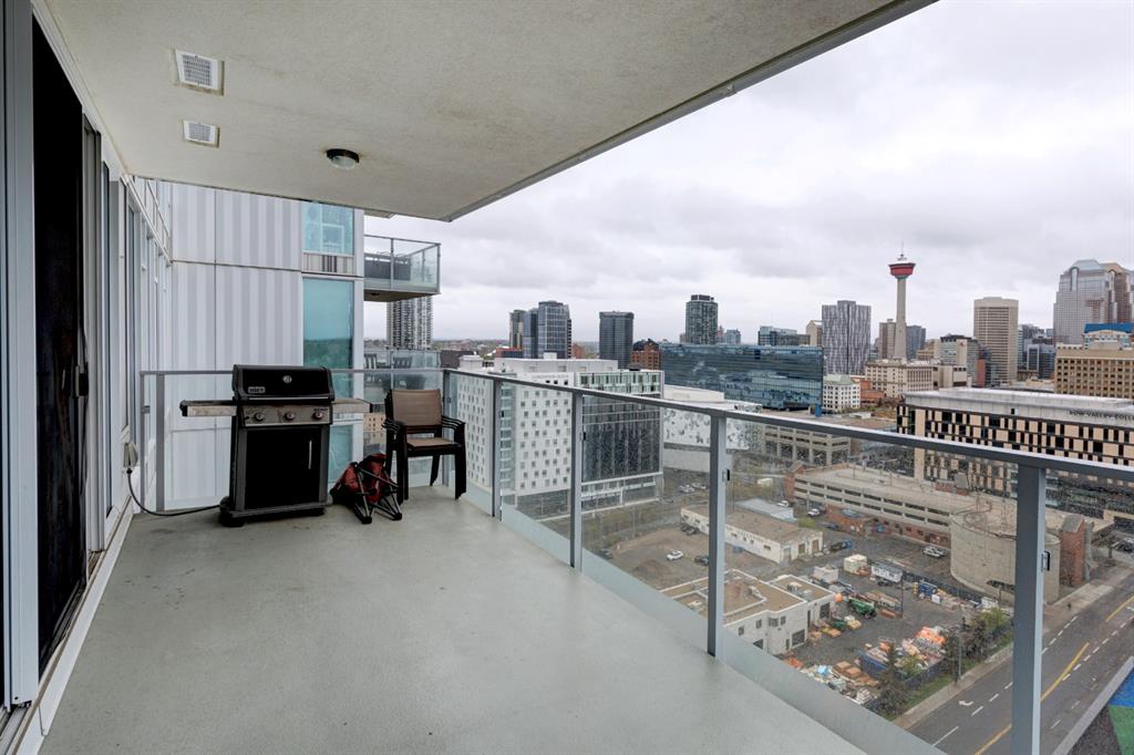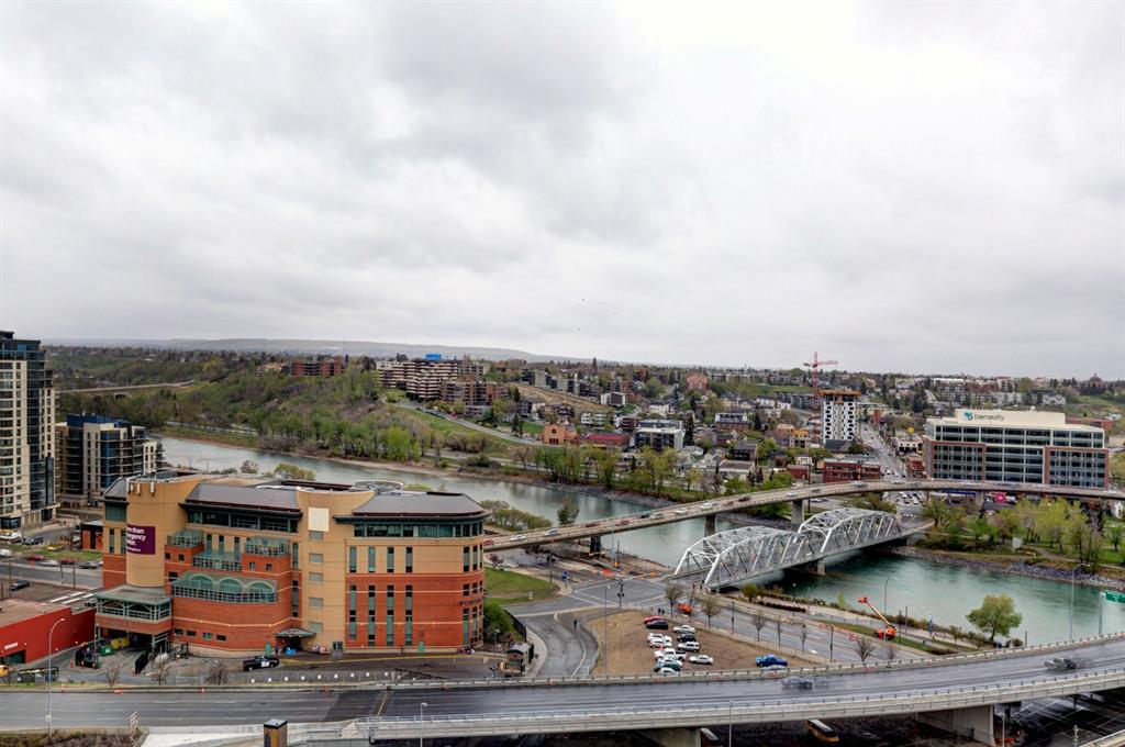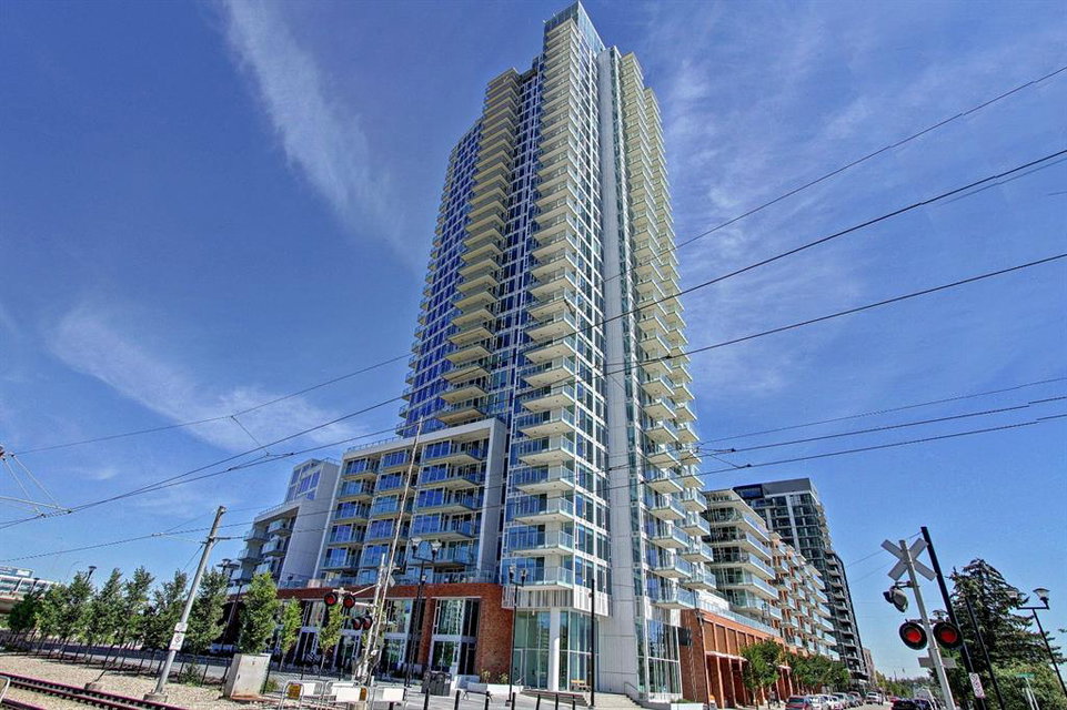 Watch the rafters floating down the Bow River and enjoy full downtown and partial mountains views!! Welcome home to this super bright & open condo perched on the 19th floor of the popular Evolution – Pulse Building! Enjoy summer evenings with friends as you watch the Bow River flow by, the city lights & the Calgary Tower from your oversized balcony. Greet guests in the large entry with walk-in front hall closet. You’ll love preparing meals in the U-shaped kitchen with stainless steel appliances, breakfast bar & granite counters. Floor to ceiling walls of windows will fill your home with natural light & give guests at your dinner parties an awesome view! The good-sized bedroom has a walk-in closet & is right next to the full bath with deep soaker tub & in-floor heating. You’ll be able to work from home in the convenient den. Features include: A/C, huge West-facing balcony with beautiful Bow River view & gas BBQ hook-up, roller blinds, Grohe taps & heated, underground parking stall. Check out the gym, social room & beautiful garden/patio on the 2nd floor & the huge lobby with a friendly concierge to greet you. Walk to work from this amazing location that is across the street from an LRT station, Winners & Superstore. You’ll love living here!!