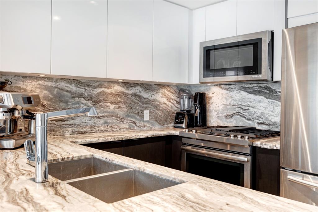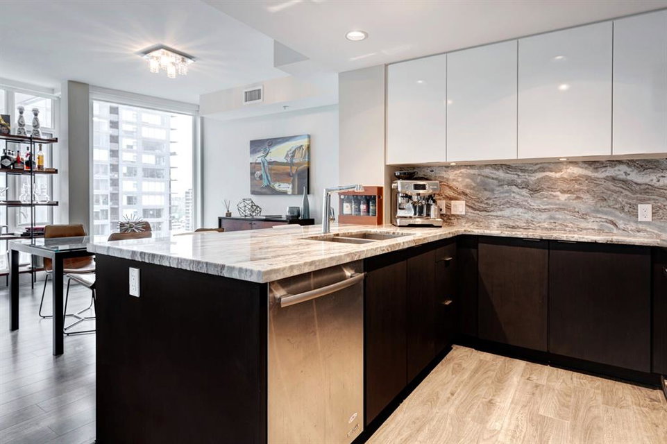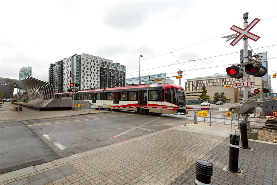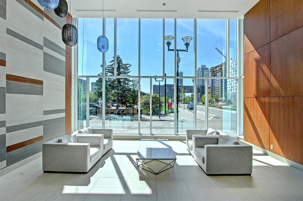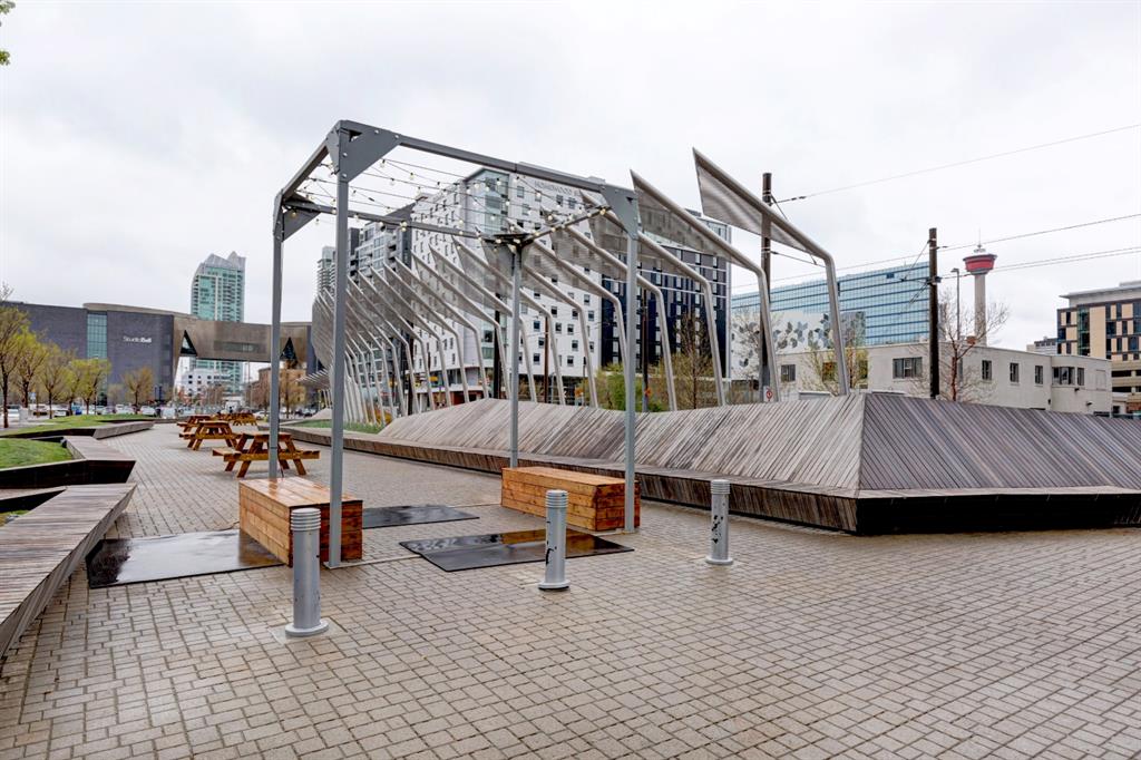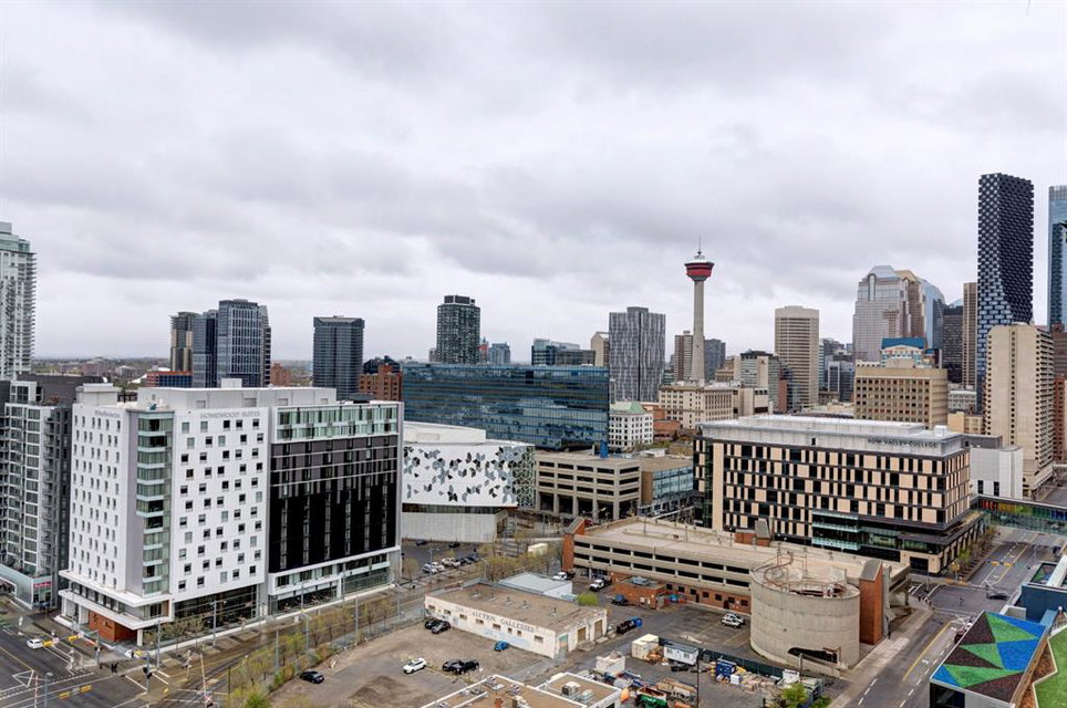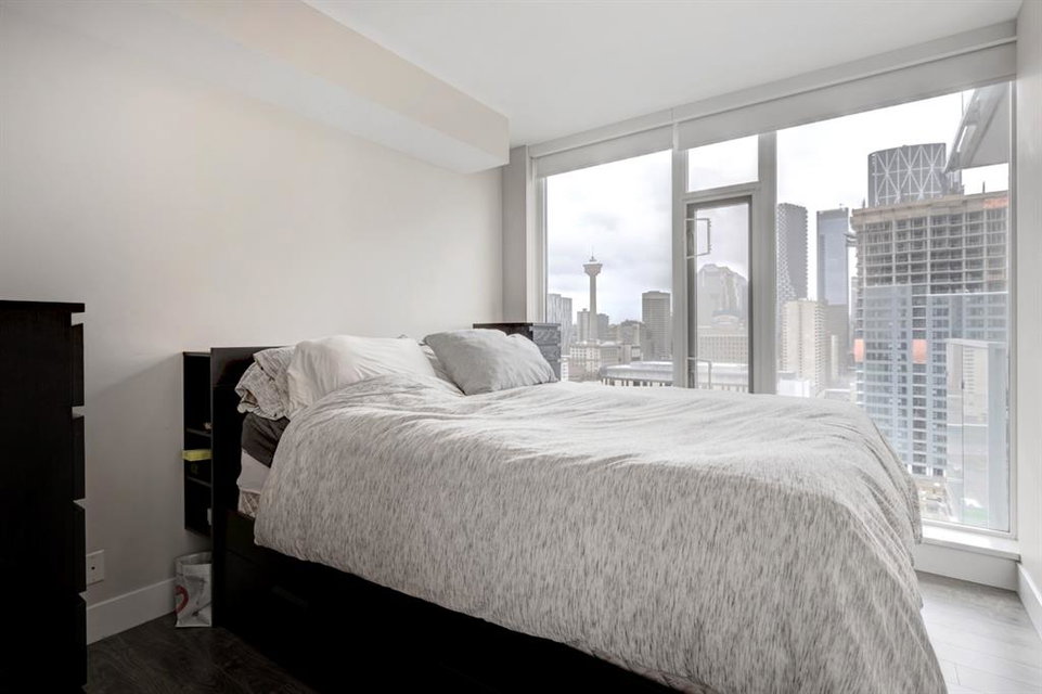 Watch the rafters floating down the Bow River and enjoy full downtown and partial mountains views!! Welcome home to this super bright & open condo perched on the 19th floor of the popular Evolution – Pulse Building! Enjoy summer evenings with friends as you watch the Bow River flow by, the city lights & the Calgary Tower from your oversized balcony. Greet guests in the large entry with walk-in front hall closet. You’ll love preparing meals in the U-shaped kitchen with stainless steel appliances, breakfast bar & granite counters. Floor to ceiling walls of windows will fill your home with natural light & give guests at your dinner parties an awesome view! The good-sized bedroom has a walk-in closet & is right next to the full bath with deep soaker tub & in-floor heating. You’ll be able to work from home in the convenient den. Features include: A/C, huge West-facing balcony with beautiful Bow River view & gas BBQ hook-up, roller blinds, Grohe taps & heated, underground parking stall. Check out the gym, social room & beautiful garden/patio on the 2nd floor & the huge lobby with a friendly concierge to greet you. Walk to work from this amazing location that is across the street from an LRT station, Winners & Superstore. You’ll love living here!!