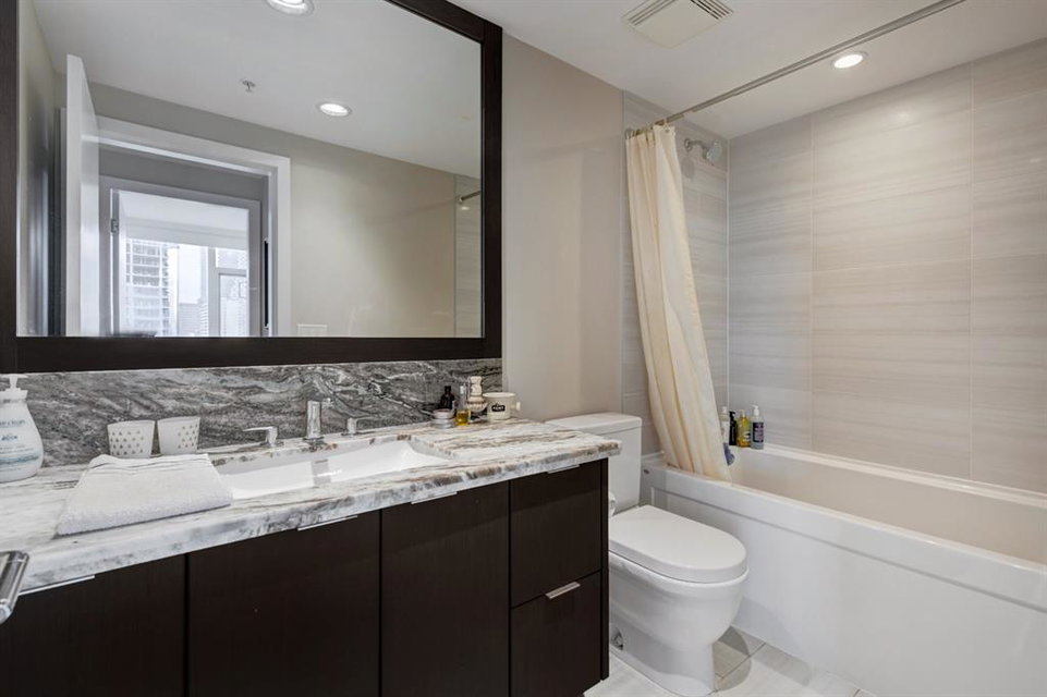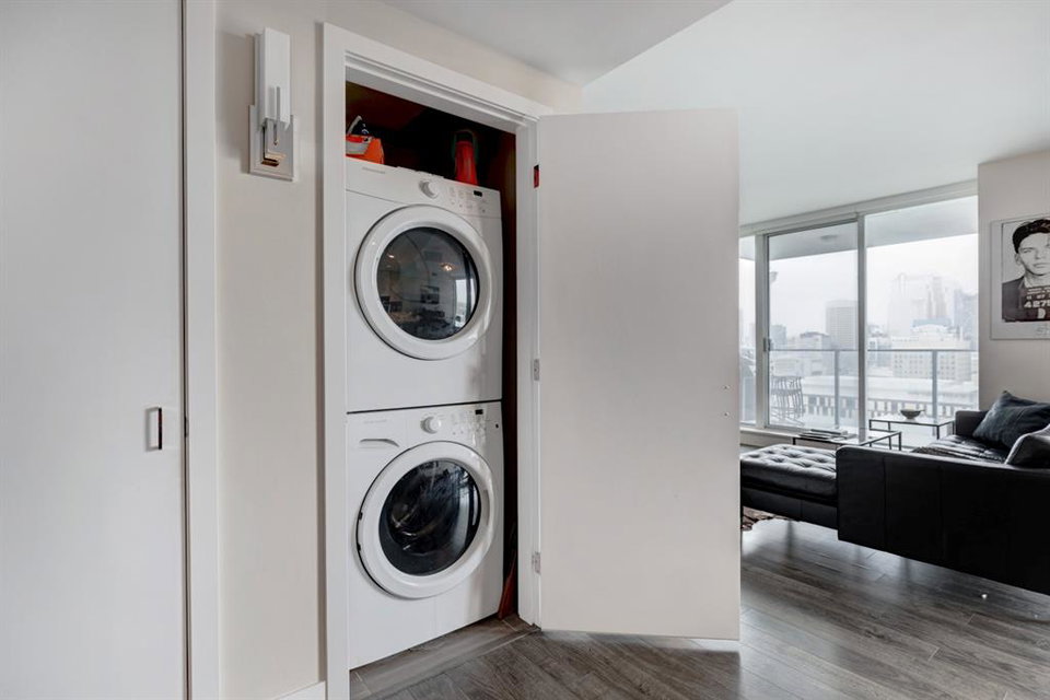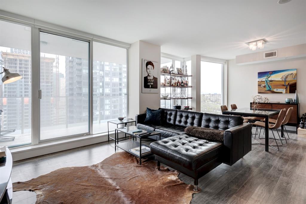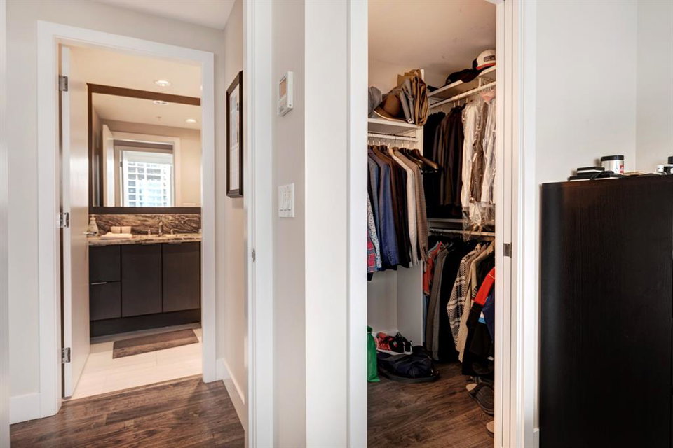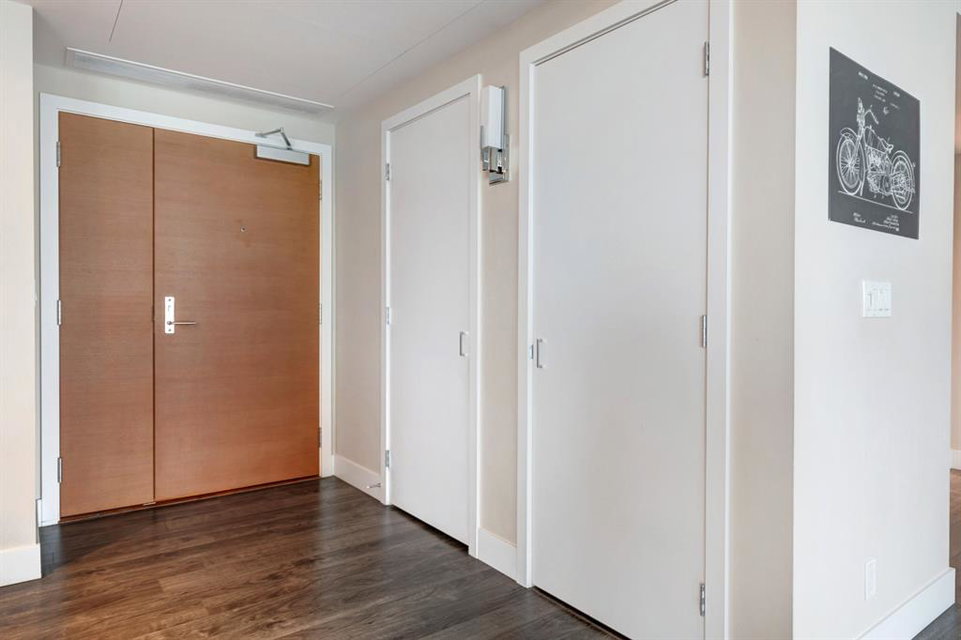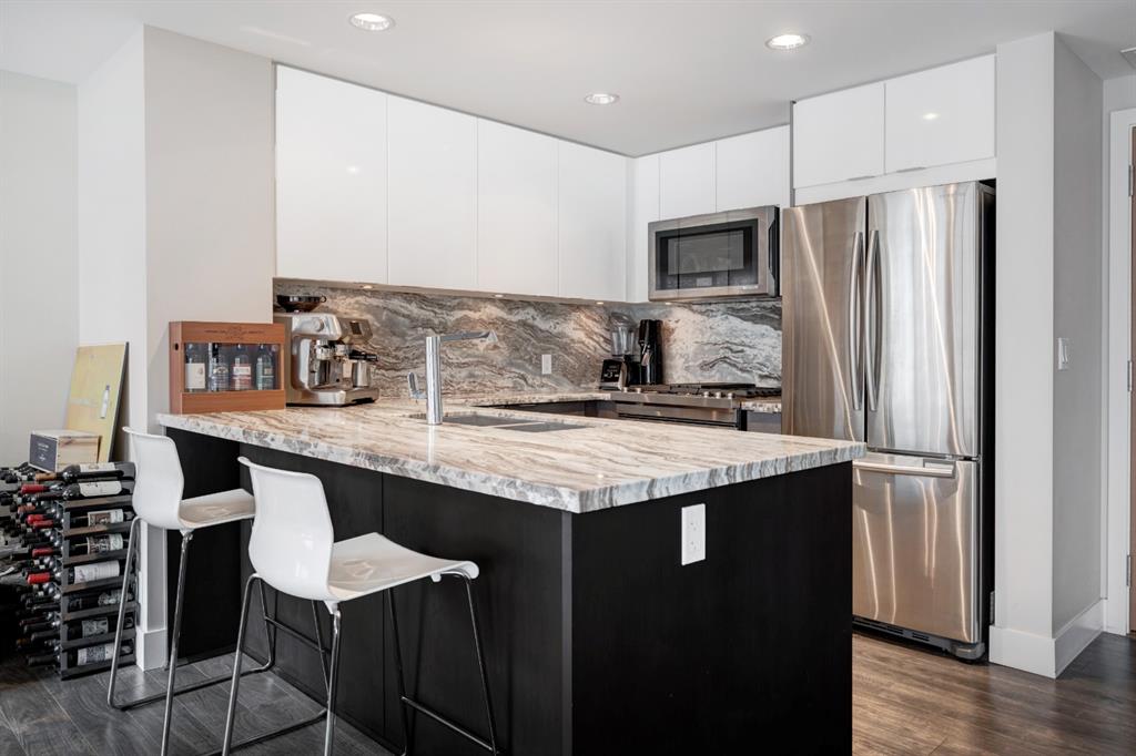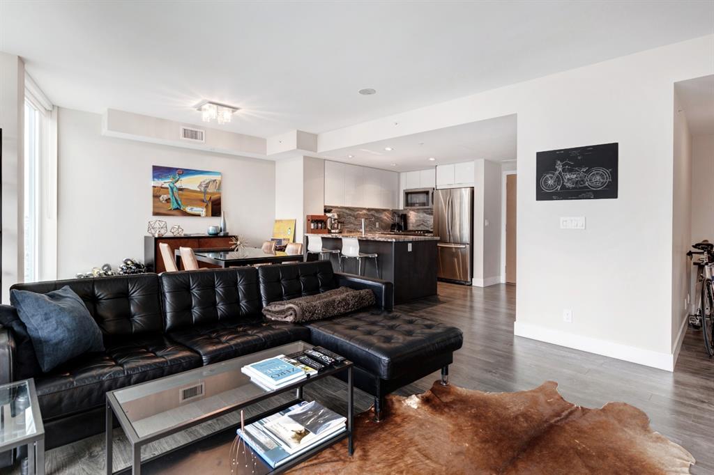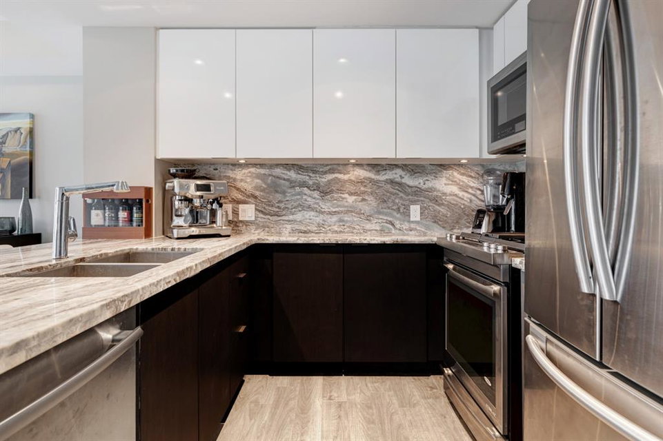 Watch the rafters floating down the Bow River and enjoy full downtown and partial mountains views!! Welcome home to this super bright & open condo perched on the 19th floor of the popular Evolution – Pulse Building! Enjoy summer evenings with friends as you watch the Bow River flow by, the city lights & the Calgary Tower from your oversized balcony. Greet guests in the large entry with walk-in front hall closet. You’ll love preparing meals in the U-shaped kitchen with stainless steel appliances, breakfast bar & granite counters. Floor to ceiling walls of windows will fill your home with natural light & give guests at your dinner parties an awesome view! The good-sized bedroom has a walk-in closet & is right next to the full bath with deep soaker tub & in-floor heating. You’ll be able to work from home in the convenient den. Features include: A/C, huge West-facing balcony with beautiful Bow River view & gas BBQ hook-up, roller blinds, Grohe taps & heated, underground parking stall. Check out the gym, social room & beautiful garden/patio on the 2nd floor & the huge lobby with a friendly concierge to greet you. Walk to work from this amazing location that is across the street from an LRT station, Winners & Superstore. You’ll love living here!!