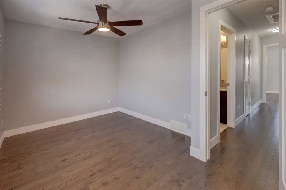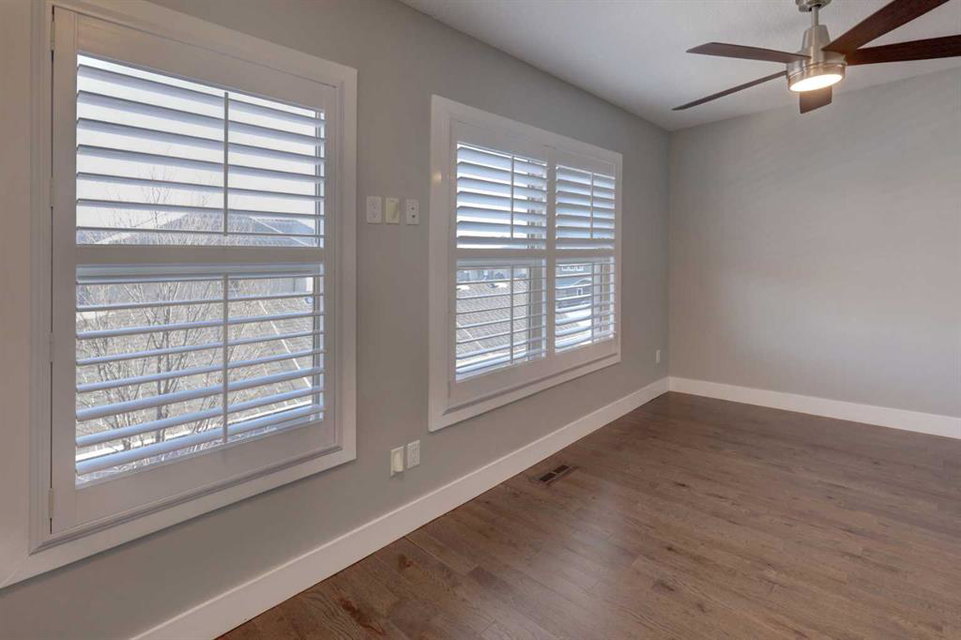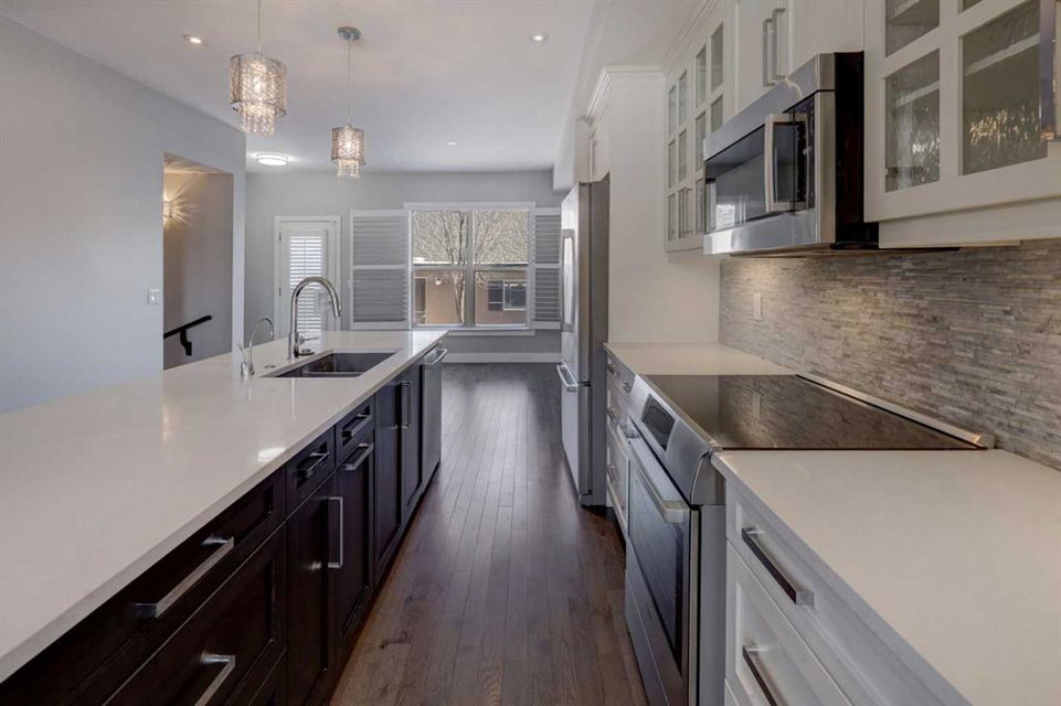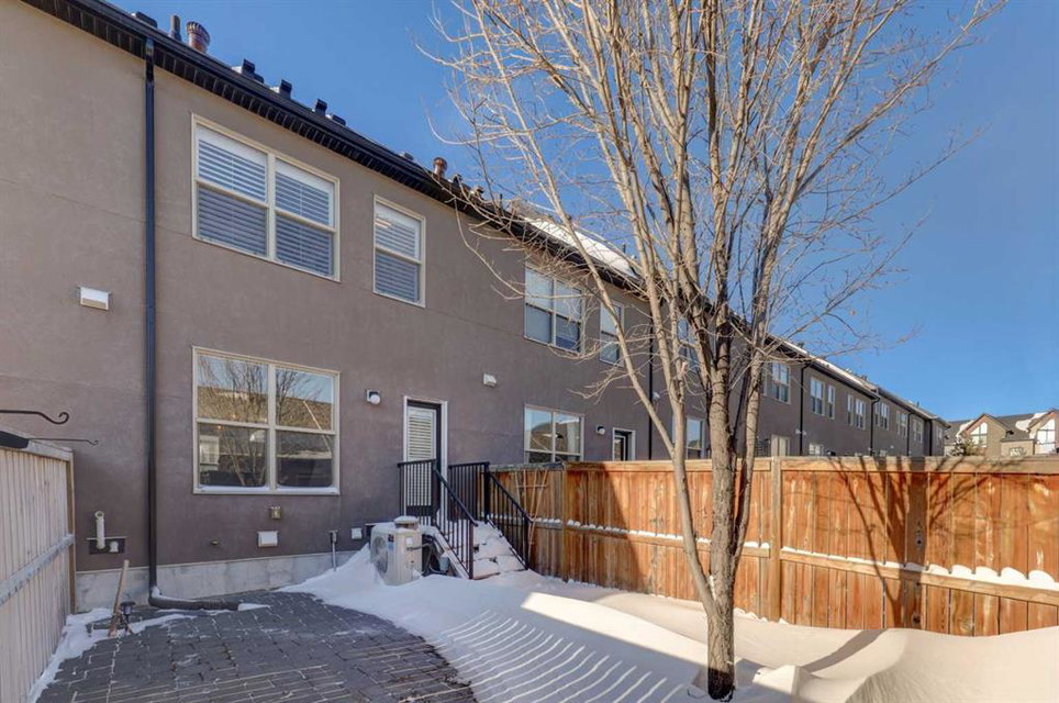 A rare find—townhome living with NO CONDO FEES! This beautifully upgraded home features 9-foot ceilings on the main floor, rich hardwood flooring, & quartz countertops on both the main & upper levels. The open-concept main floor offers spacious living & dining areas framed by elegant windows, while the upgraded kitchen is a true standout. Highlights include high-end Bosch stainless steel appliances, a large centre island with white quartz countertops, under-cabinet lighting, soft-close drawers & doors, & full-height cabinetry for a sleek, modern finish. A rear mud room keeps the family boots & coats organized while the beautiful living, dining & kitchen spaces are perfect for entertaining & family living. Upstairs, hardwood flooring continues throughout, leading to two generously sized bedrooms, each with large closets & custom built-in organizers. The ensuite bathroom is finished with quartz countertops & upgraded counter-to-ceiling mirrors, while the second full bathroom features quartz counters & a tub/shower combination. A conveniently located upper-level laundry room completes this floor. The fully developed basement adds exceptional versatility, offering a flex space ideal for a bedroom, gym, or home theatre, along with an additional full bathroom & abundant storage. Outside, enjoy your private, low-maintenance backyard with stone patio, plus a double detached garage. Additional upgrades include enhanced faucets, lighting, & interior doors, 2.5-inch plantation shutters throughout, air conditioning, new washer & dryer (2025), new hail-resistant shingles, eavestroughs, & downspouts (2025). Ideally located steps from pathways, playgrounds, grocery stores, restaurants, coffee shops, banks, & more, this exceptional home truly checks every box. A must-see!