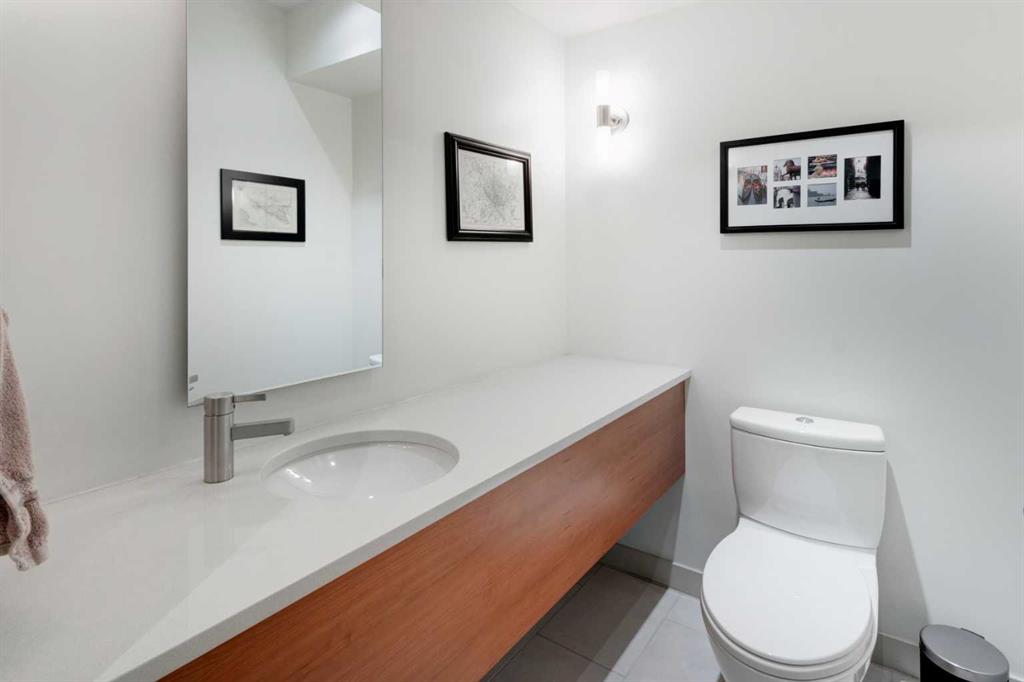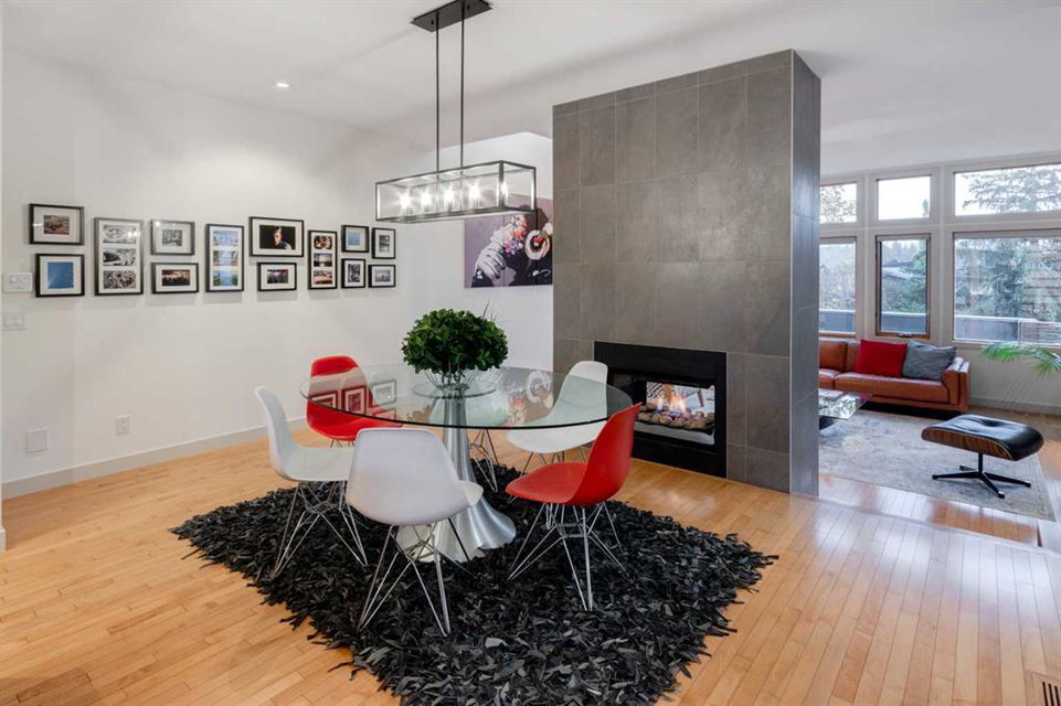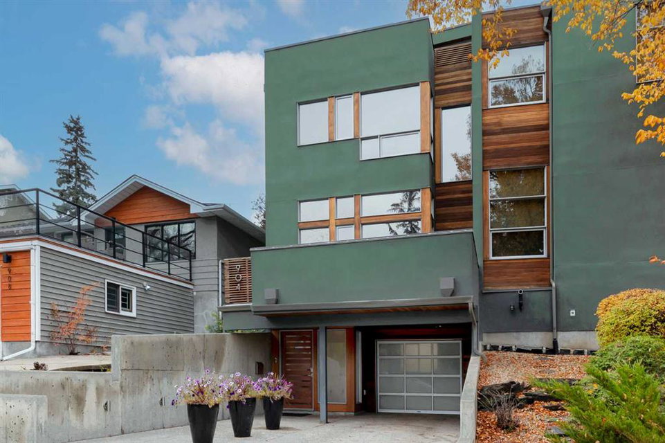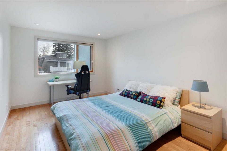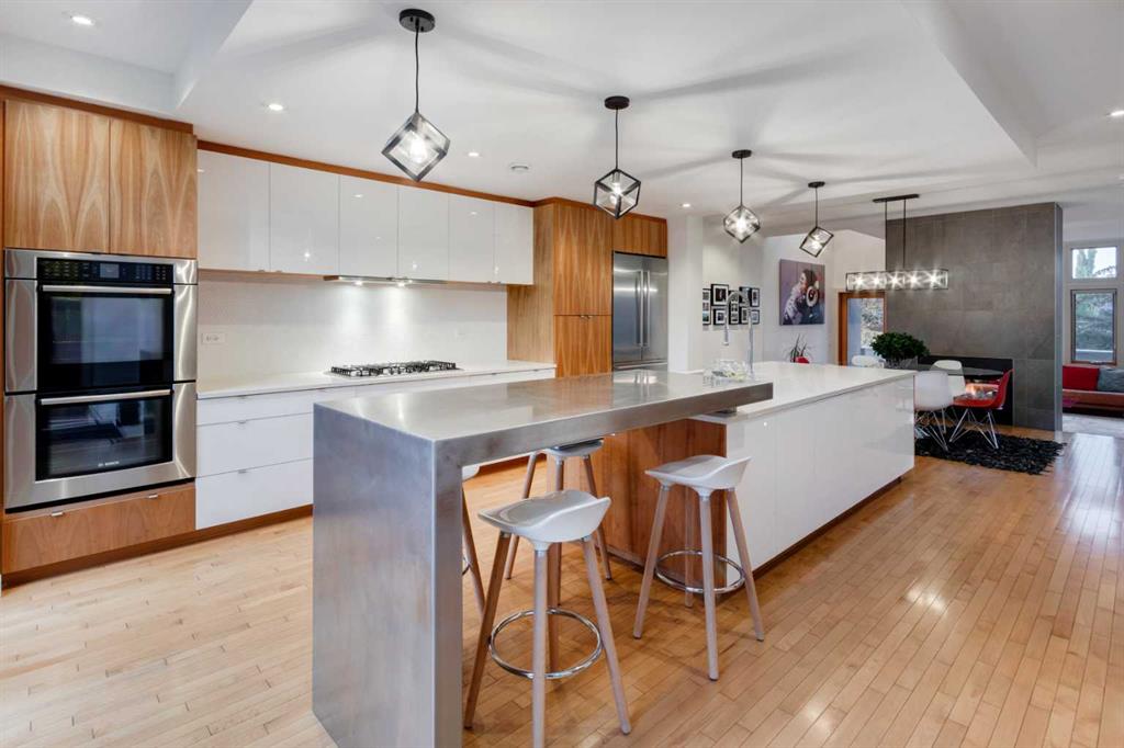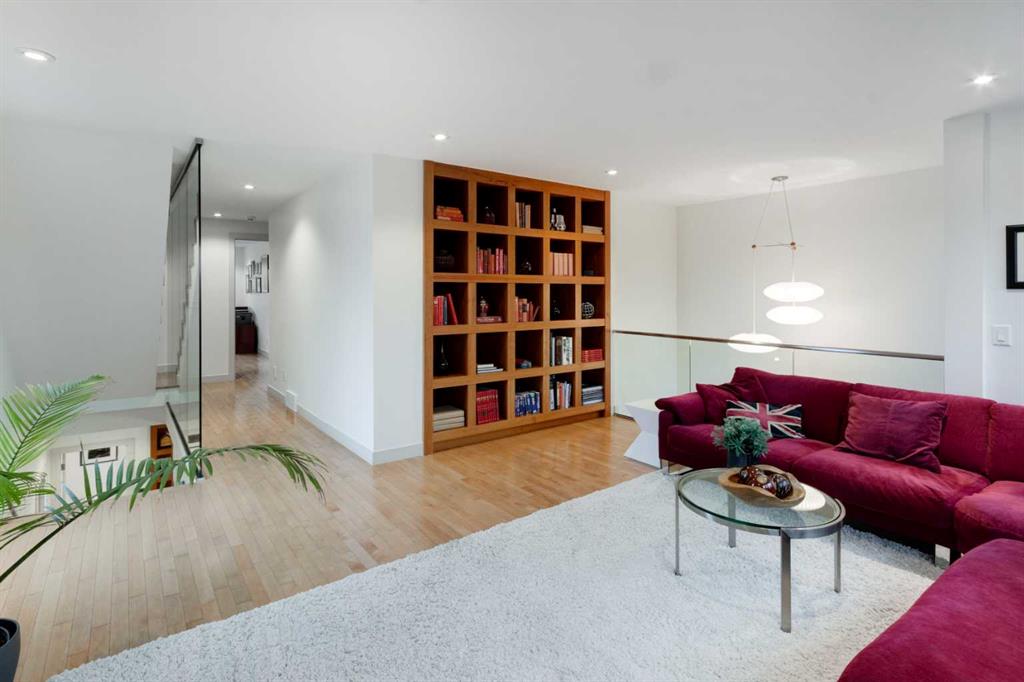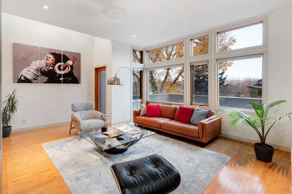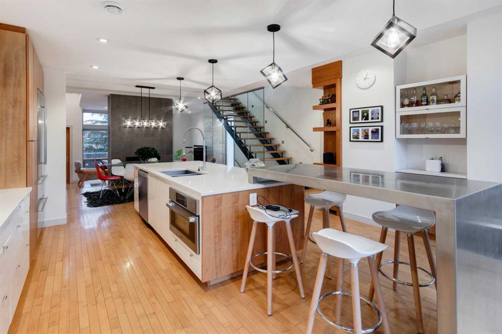 Embrace West Coast modern urban living in this stunning 3-bedroom home situated in the peaceful Cambrian Heights neighborhood, overlooking the picturesque Confederation Park. This residence features abundant natural light, a spacious layout, and awe-inspiring downtown skyline views, epitomizing a blend of elegance, practicality, and an unbeatable location. Upon entry into the reverse walkout, you’ll encounter ample natural light, a roomy foyer, a convenient powder room, and a flexible office / gym / hobby space that can be easily transformed back into an attached garage. The main level unveils a chef’s dream kitchen with a massive island, white quartz countertops, white hi-gloss cabinets, and top-notch Bosch appliances. The expansive stainless steel raised eating bar creates an ideal space for relaxed dining and entertaining. The two-sided fireplace adds a cozy touch to the expansive living and dining areas, which open to a south-facing deck featuring a gas hookup for outdoor meals. Take the open-riser staircase with glass side walls up to the second floor and discover two generously sized bedrooms, a well-appointed bathroom, laundry room, and a family room that serves as an ideal space for gatherings, relaxation, or a home office. Ascend to the third floor, where the master bedroom awaits, complete with a private south-facing balcony allowing you to bask in the sun’s rays or enjoy a nightcap while gazing at the stars and downtown skyline. The spa-like ensuite includes a jetted tub, a separate shower, and dual vanities for a tranquil retreat. This residence offers notable features, such as extensive custom millwork, wired ethernet throughout, California Closets, security cameras, high-end plumbing fixtures, a medical-grade air cleaner, and heated flooring in the basement and office, excluding mechanical room. A concrete rear courtyard with a gas hookup enhances the outdoor living experience. Parking is effortless with a detached garage and a covered carport. This home is located next to Confederation Park, complete with playground, walking/bike paths, duck pond, tennis & pickleball courts, playing fields and cross-country skiing. Off-leash dog park is located one block away. Boasting a sleek design and thoughtful spaces, this home offers a unique and unparalleled living experience. Don’t miss the opportunity to make this meticulously designed property your forever home. Contact us today to arrange a viewing and immerse yourself in luxury within an urban setting